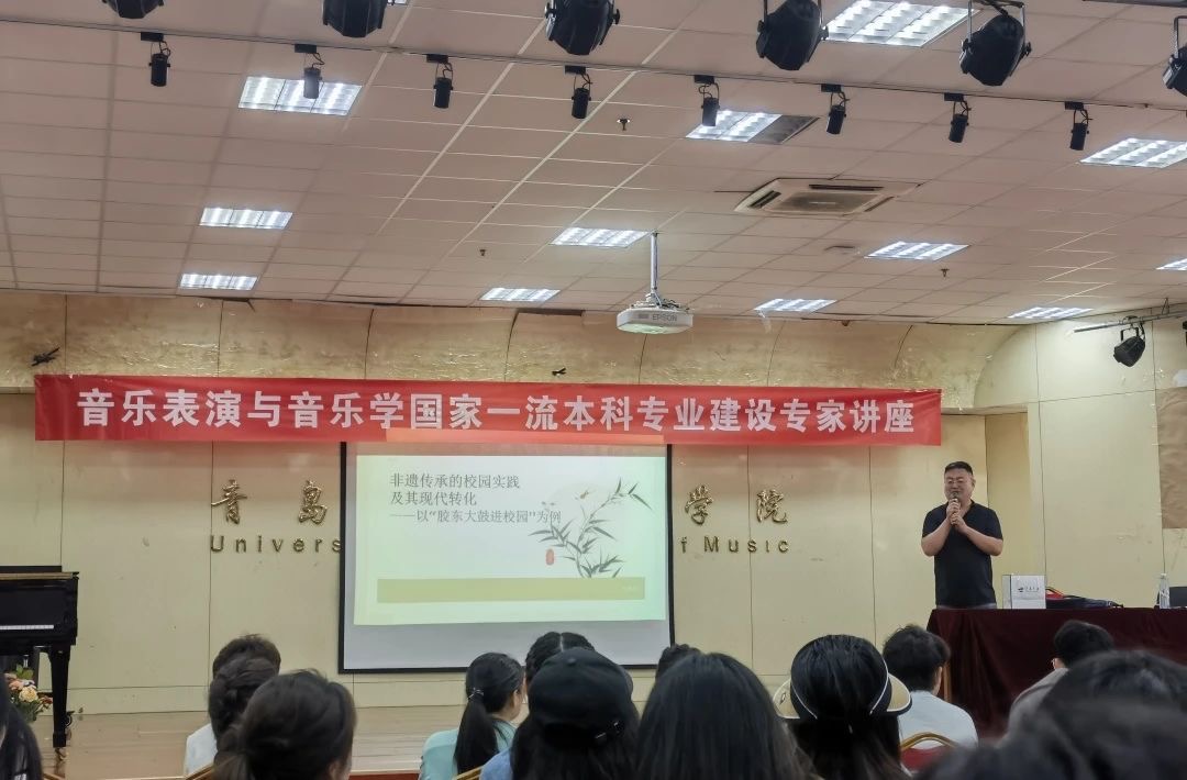 马新涛老师先讲述了自己的艺术成长经历和大学生活,鼓励同学们既要认真学习,又要将所学到的知识应用于实践。接着引入了正题,以非遗传承的校园实践及其现代转化—以“胶东大鼓进校园”为例,讲述了在新时代下如何更好地将音乐非遗文化在校园中教授传承。尤其是"创、学、教、练、演、研"的"六链条传承机制"为传统艺术进校园的具体实施步骤打开了新思路。此外,马新涛院长还为同学们分享了很多实用的授课技巧,使同学们受益匪浅。整场讲座现场学术氛围浓厚。