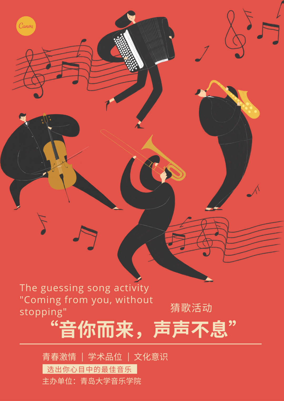 通过举办猜歌活动,播放流行歌曲,组织参赛学生参加抢答题猜歌活动,提升学生专业素养。丰富大学生活,同时提升自身能力,进一步传承和发展音乐文化。