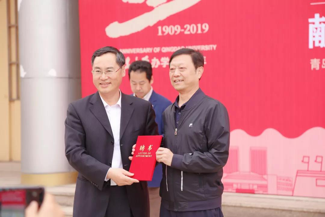 青岛大学党委常委、副校长李军教授为刘勇、上官超英两位校友颁发兼职教授聘书。