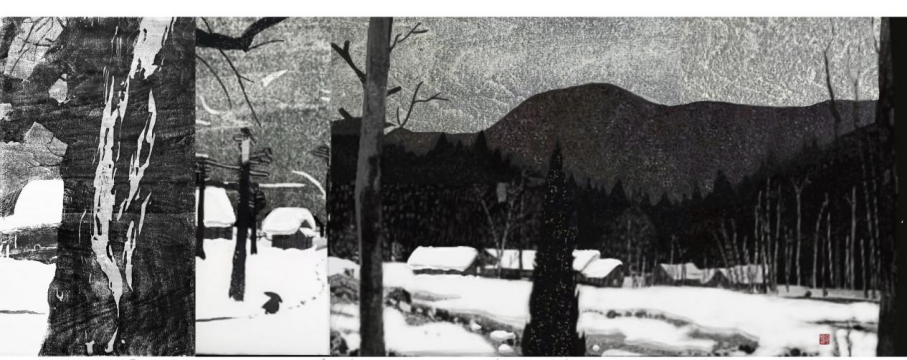 作品采用中国传统水印木刻版画技法表现山村雪景,在印制材料与方法上则采用了中国宣纸与国画水性颜料,印制出来的作品色彩透明纯净,不仅有中国传统绘画元气淋漓、墨韵十足的意趣,而且蕴含着现代木刻版画的刀味与木味,利用水印木刻其特殊的印痕肌理艺术语言和与生俱来的文化品格,运用木板的天然纹理填充画面,表现质朴、沉静的乡情色彩。