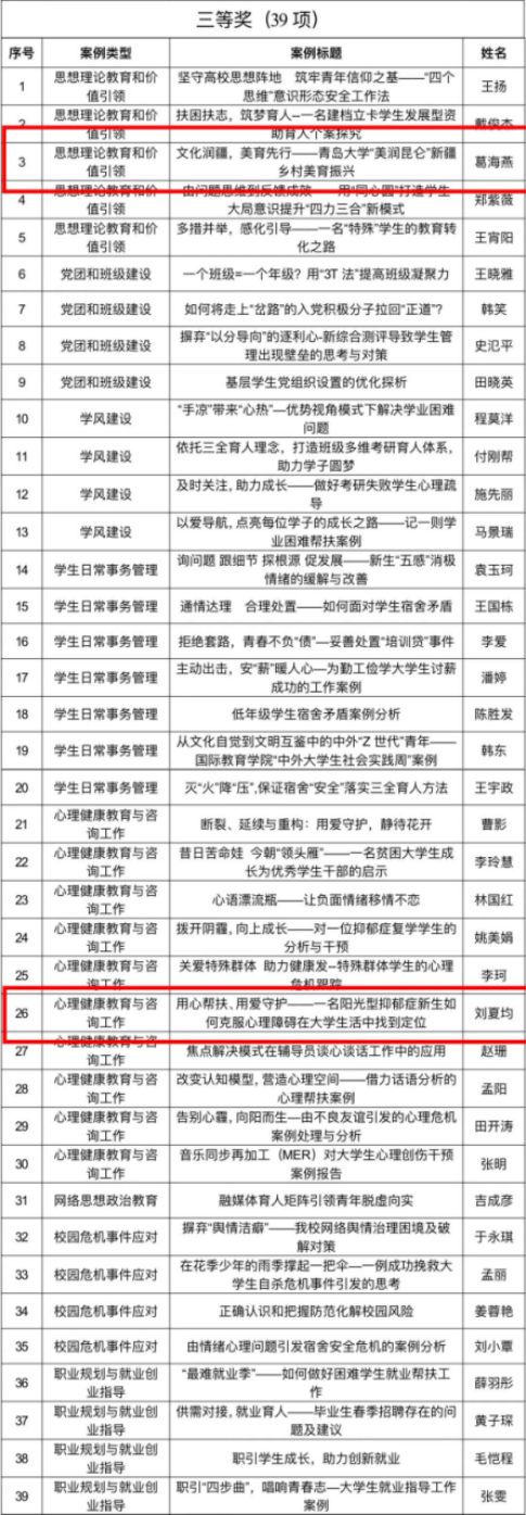 王宁老师的《关于帮助心理问题学生走出心理阴霾的工作案例》与谷丽林老师的《探索心理育人模式,助力学生健康成长——一则大一新生经济困难、适应能力差的学生帮扶案例》,分别在“心理健康教育与咨询工作”领域荣获优秀奖,展现了澳门赌场老虎机