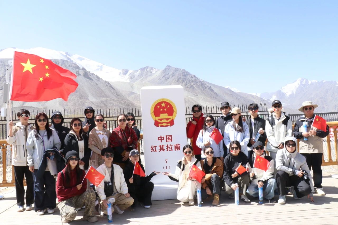 实践团跨越5000公里,来到红其拉甫国门,在国门下,团队开展“行走的思政课”,把课堂搬到祖国边境线上。当实践团登上海拔5100米的红其拉甫国门时,看到伫立在国门边的红其拉甫边防连,认真聆听学习“扎根帕米尔,忠诚戍边关”红其拉甫精神,在界碑前驻足凝视,深切感受边疆守护者的责任与担当。体会到唯有到过边关,才能真切理解家国情怀,边防军人们将个人理想追求融入党和国家事业,让青春在爱国奉献中闪耀。随后,实践团在巍峨的国门下整齐列队,共同唱响《歌唱祖国》与《我和我的祖国》。激昂的旋律在帕米尔高原的风中回荡,每一句歌词都饱含着对祖国的赤诚热爱,每一个音符都传递着青年一代的坚定信念。