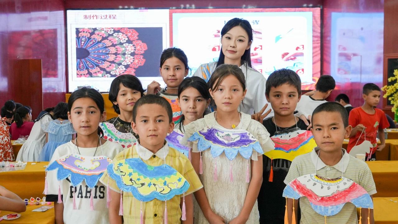 云肩课程中,孩子们看着精美的云肩图案,听支教老师讲解其蕴含的吉祥寓意和传统服饰文化,尝试用普通话表达自己对云肩的喜爱和理解,体验传统手工艺的精妙。新疆模戳课程,让孩子们了解新疆当地独特的模戳艺术,跟随支教老师学习用模戳印制图案,并用普通话交流制作心得,在实践中加深对家乡文化的认识。钻石画课程中,孩子们专注地将一颗颗钻石粘贴在画布上,支教老师在旁指导,鼓励他们用普通话描述画面内容,锻炼语言表达能力,一幅美丽的钻石画完成时,孩子们满满的成就感都化作了流利的普通话表达。
