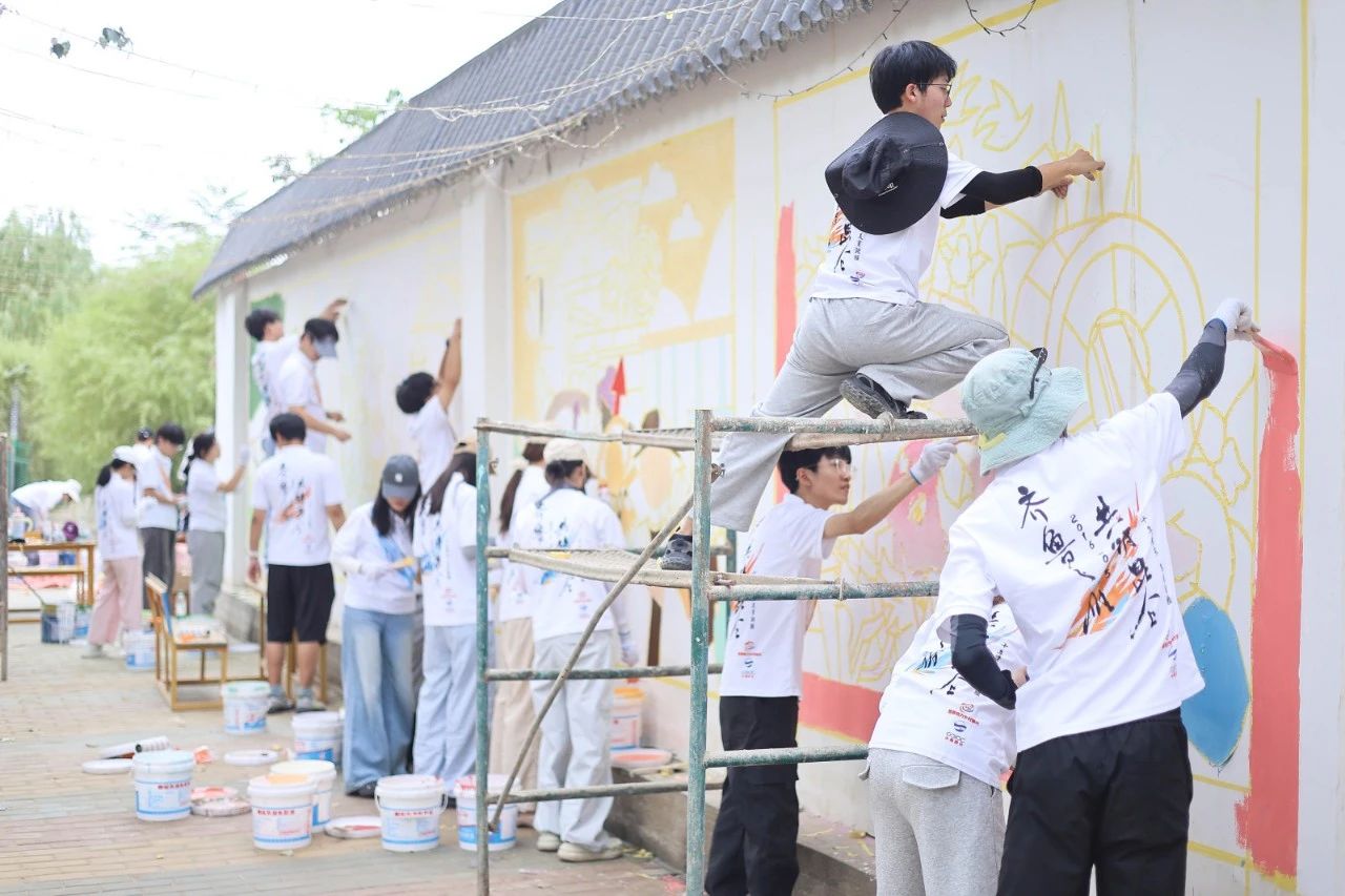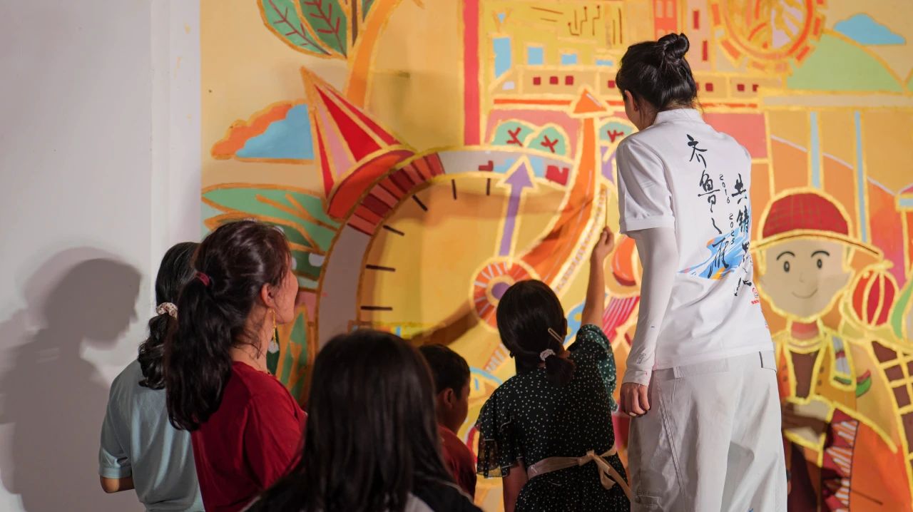 团队顶着昆仑山北麓的干燥烈日与风沙,在为于田县多个村庄绘制红色党建、乡村振兴、民族团结主题墙绘时,当地的小朋友和村民纷纷表示想要共同参与墙绘创作。绘制现场,大家围聚在墙前,团队成员一边示范勾勒线条,一边用普通话讲解画面里的故事,“这是丰收的麦田,代表着乡村振兴”“ 这面红旗象征着党的引领”。小朋友们踮着脚递颜料,跟着老师学说“团结”“奋斗”等词汇;村民们握着画笔涂色,在交流配色时自然地用上刚学会的普通话表达。1000余平方米的墙绘不仅成了村里的“文化风景线”,更成了推广普通话的生动课堂,大家在共同创作中,用语言串联起情感,让党的思想与团结的力量在交流中愈发深入人心。