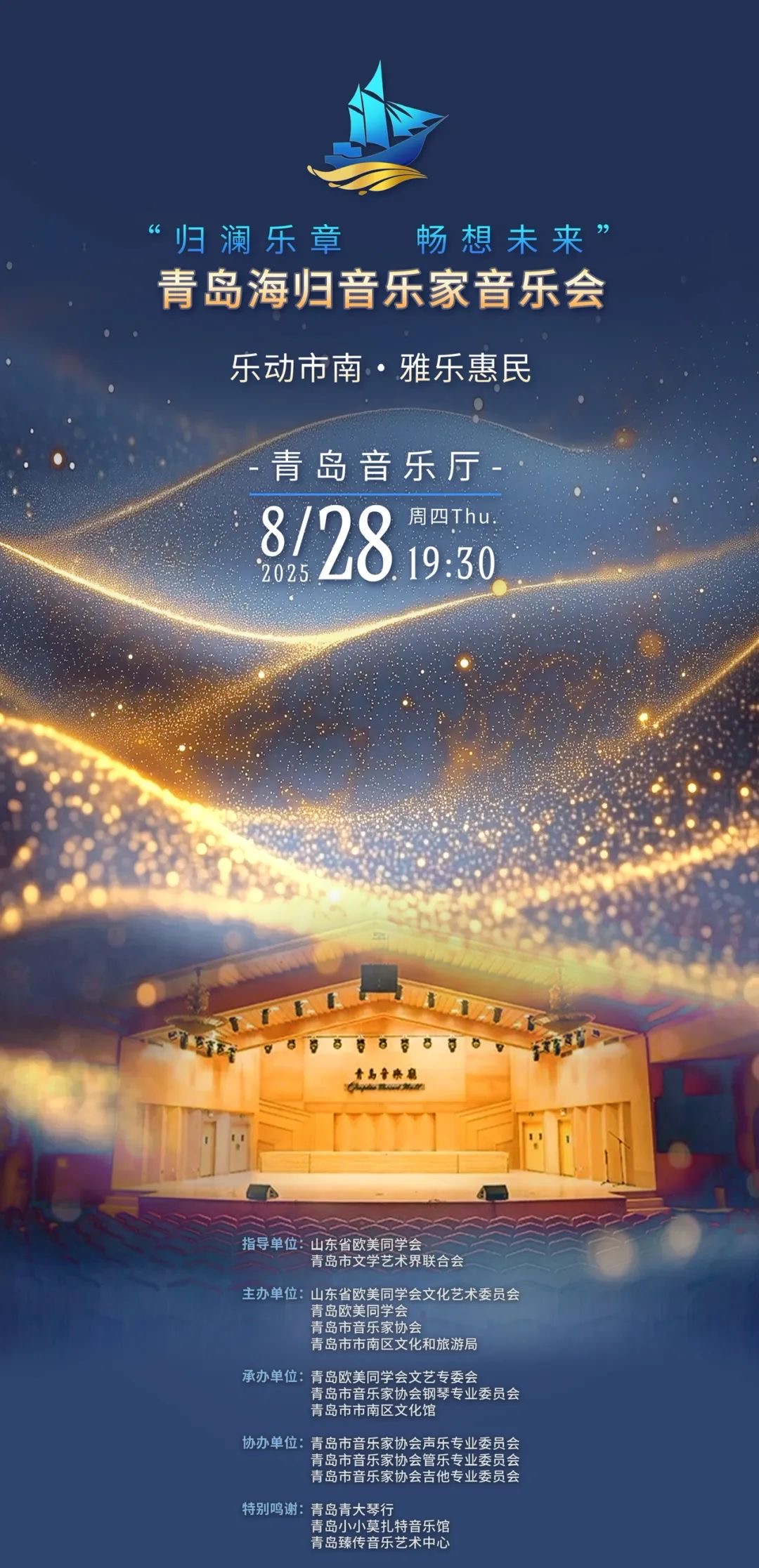 盛夏的光影伴随着灵动的音符,2025年8月28日晚,一场文化艺术的视听盛宴——“归澜乐章、畅想未来”青岛海归音乐家音乐会在青岛音乐厅成功举办。