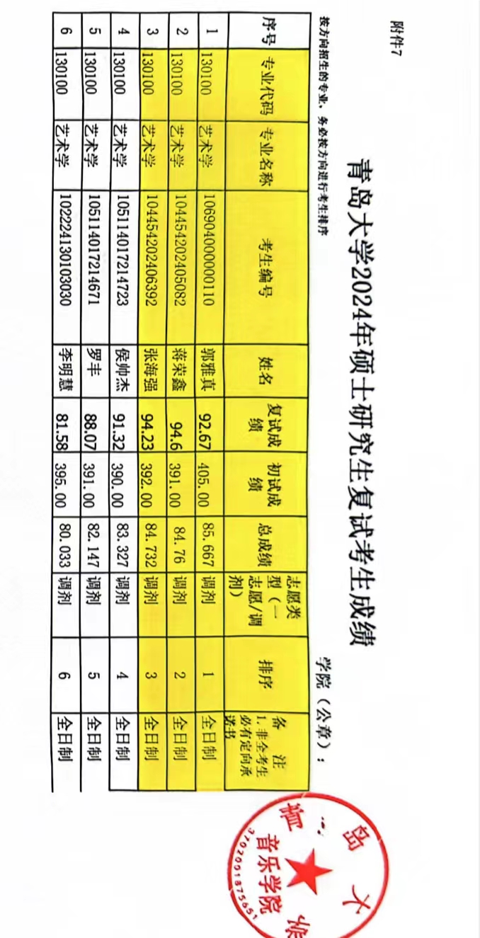 各位考生:现将2024年青岛大学音乐澳门赌场老虎机 研究生调剂考生成绩予以公示。如有异议,请联系澳门赌场老虎机 招生负责老师。联系人:毕老师 电话:85953738