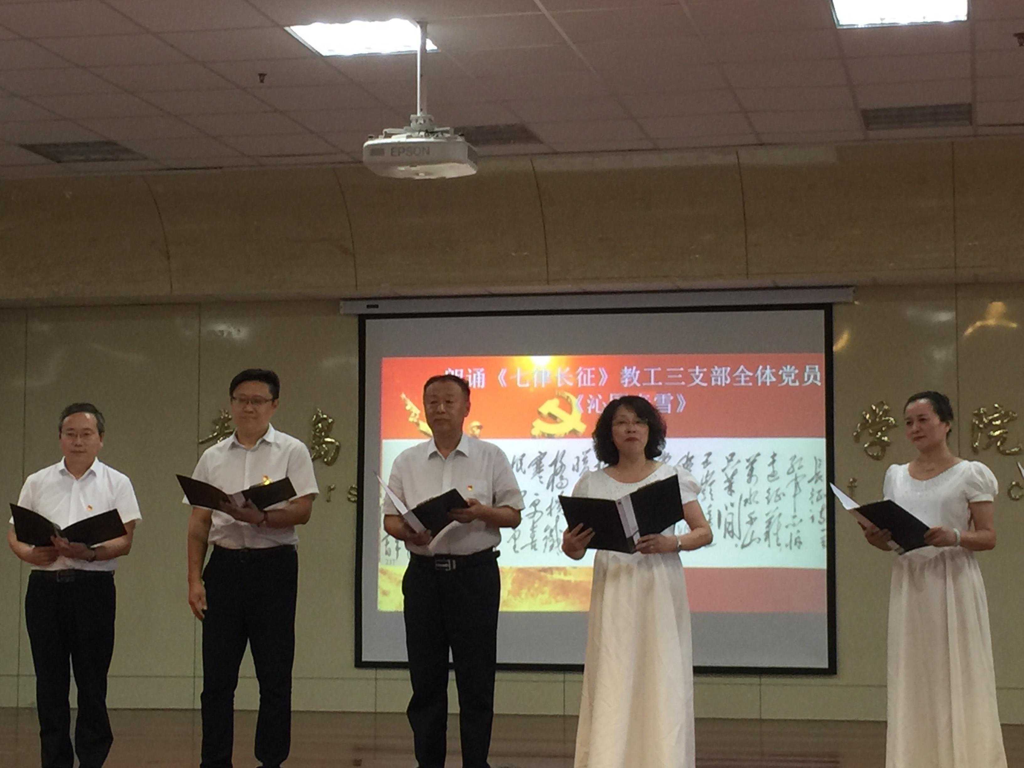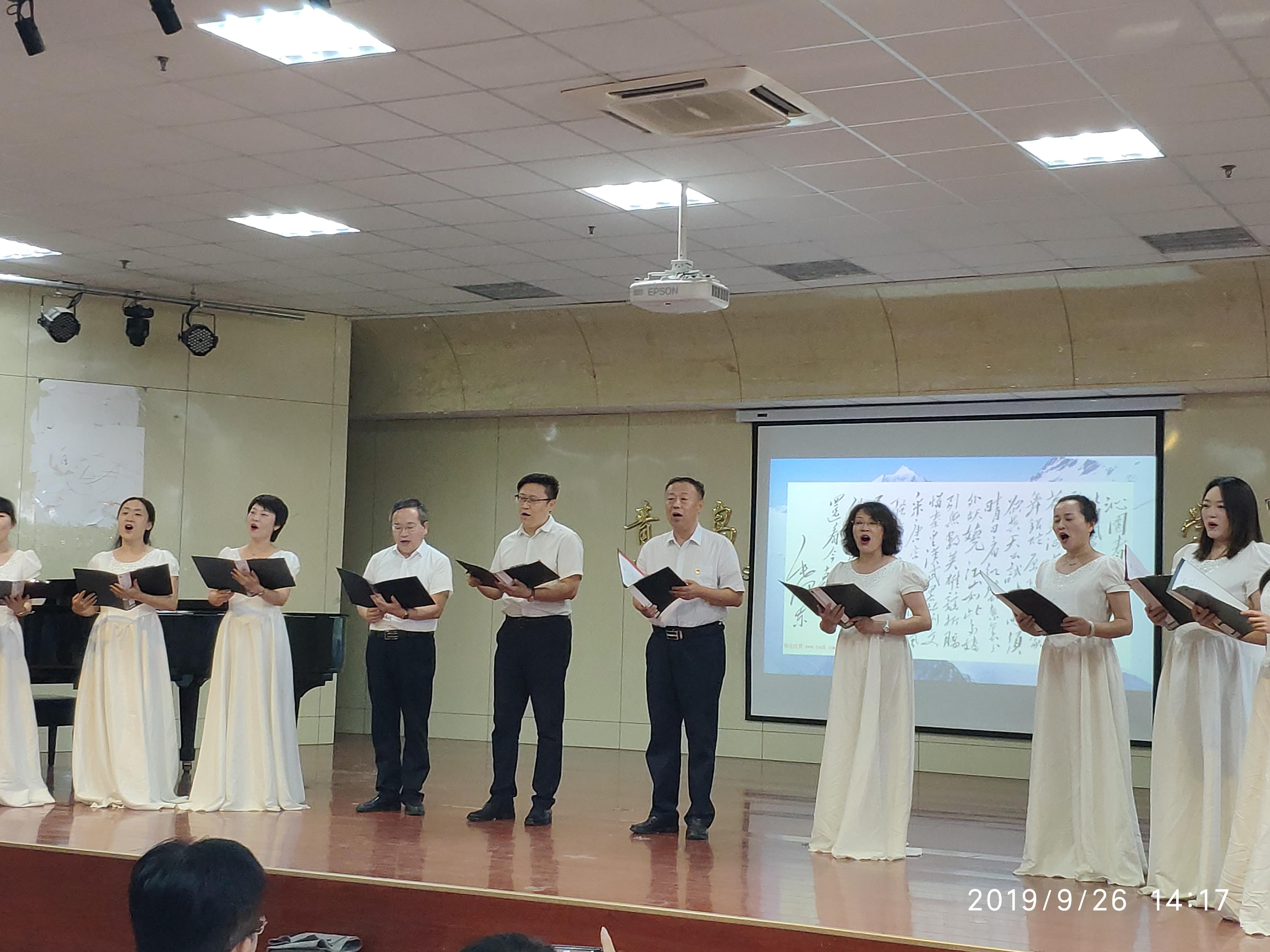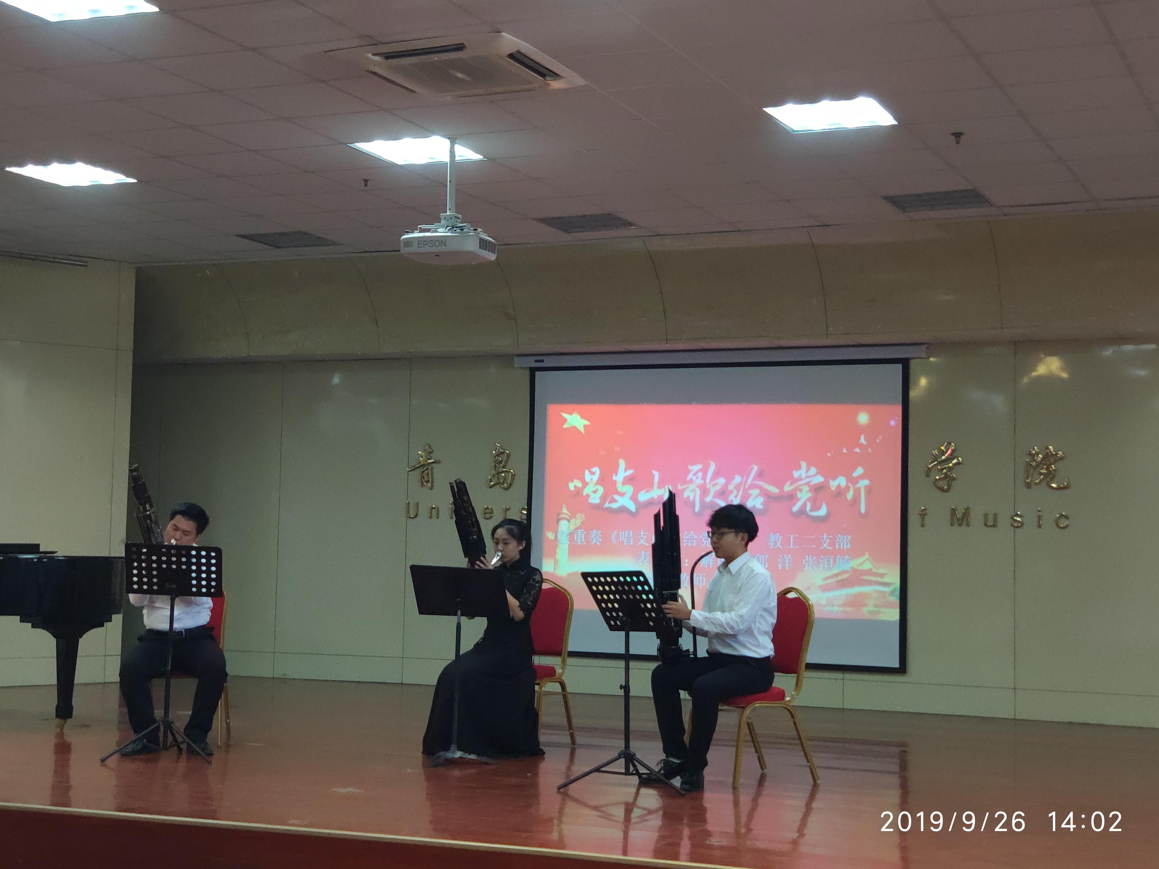 专业特长优势,共同完成了九个节目的表演。教工二支部以笙乐器的三重奏《唱支山歌给党听》,拉开了特色党课的序幕,男低音独唱《黄鹤楼》、女声二重唱《卜算子·咏梅》、男高音独唱《七律·长征》、学生党支部的小合唱《娄山关》,在不同音色的对比中,表达出了共产党人的革命乐观主义和坚强不屈的奋斗精神。教工三支部的全体党员同志集体表演了诗词朗诵《长征》《沁园春·雪》,党委书记姜世安以书法形式展示毛泽东诗词作品。最后,教工一支部的全体党员集体大合唱《沁园春·雪》,以气势磅礴的演唱表达了全体党员祝福祖国70华诞、祝愿祖国繁荣昌盛国泰民安的心声。