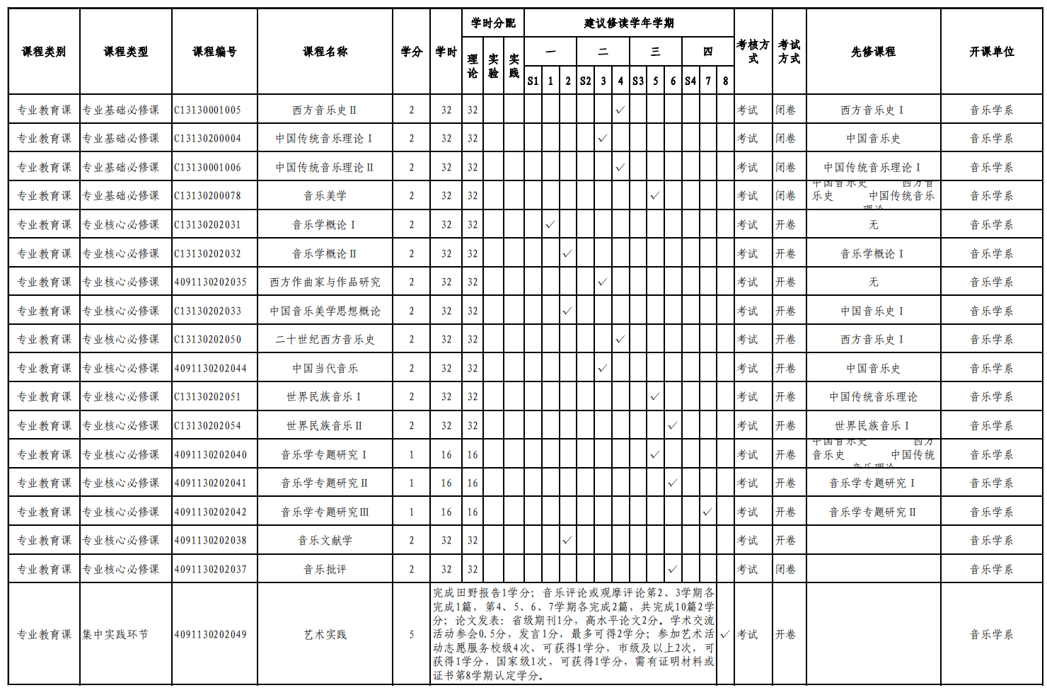 艺术实践、音乐学论文或评论写作与发表、音乐学学术报告、田野采风、中小学音乐教育实习。
