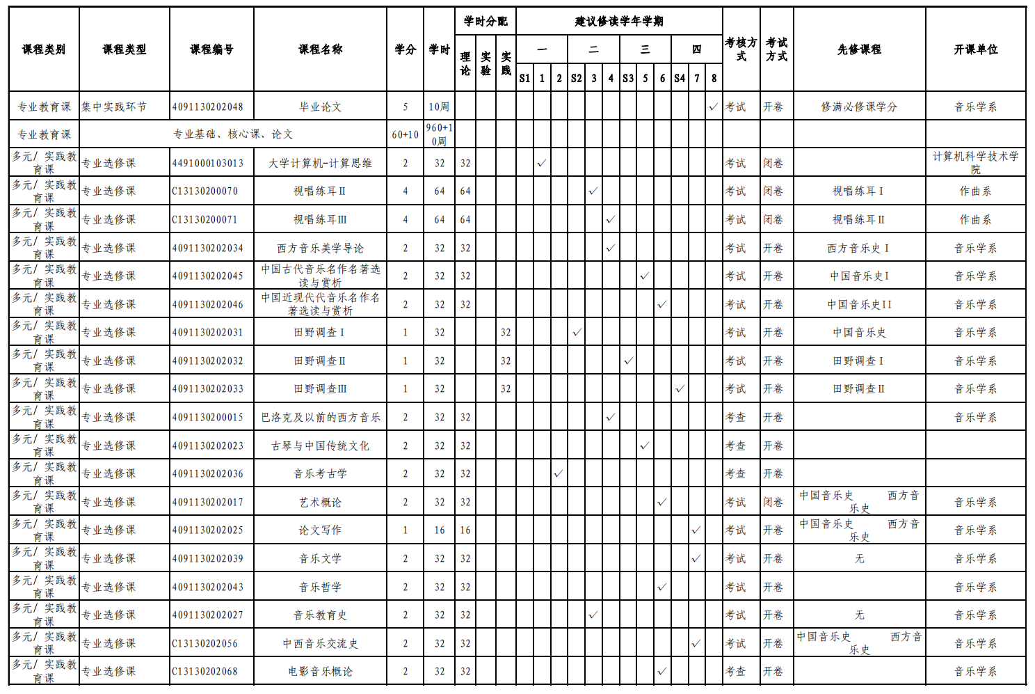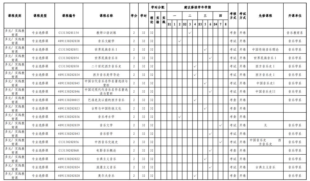 ⑨深入学习音乐学其他技能,如音乐编辑、音乐评论、文化管理等。了解电影音乐,流行音乐等不同门类的音乐风格,使学生能够胜任未来不同音乐理论方向的研究与教学工作。