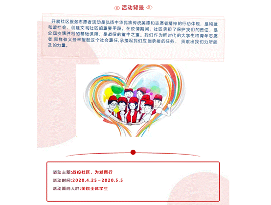 开展社区服务志愿者活动是弘扬中华民族传统美德和志愿者精神的行动体现,是构建和谐社会、创建文明社区的重要手段。在疫情期间,社区承担了保护我们的责任,是全国疫情胜利的基础保障,是战役的重中之重。我们作为新时代的大学生和青年志愿者,同样有义务来担起这个社会重任,承接起我们应当承接的任务, 贡献出我们力所能及的力量。