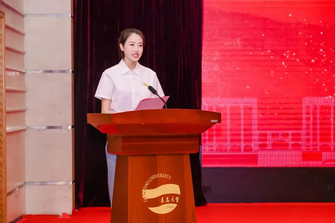 感谢叶小菲学姐为我佩戴校徽,佩戴上青岛大学校徽,我感受到了青大文化的传承,也感受到了沉甸甸的责任,我们来自五湖四海,今天在这里欢聚,分享一个共同的称号——青大人,我无比地自豪!