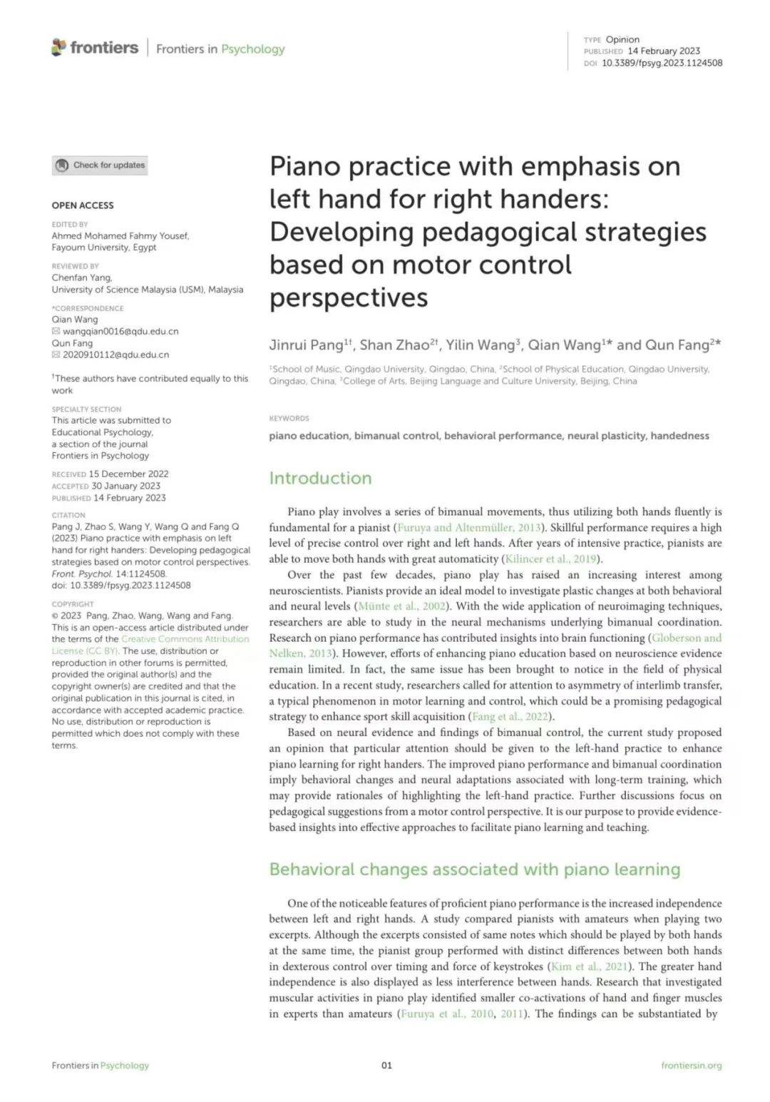 2019级音乐学本科生逄金瑞以第一作者身份在FRONTIERS IN PSYCHOLOGY(IF=4.232,心理学跨学科类SSCI一区)发表论文“Piano practice with emphasis on left hand for right handers: Developing pedagogical strategies based on motor control perspectives”(DOI:10.3389/fpsyg.2023.1124508)。该研究论文由青岛大学独立完成,音乐澳门赌场老虎机