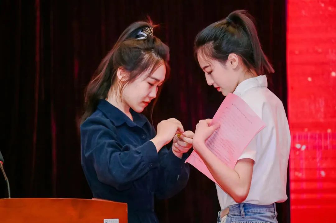 感谢叶小菲学姐为我佩戴校徽,佩戴上青岛大学校徽,我感受到了青大文化的传承,也感受到了沉甸甸的责任,我们来自五湖四海,今天在这里欢聚,分享一个共同的称号——青大人,我无比地自豪!